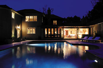 This spectacular outdoor living room, terrace and heated pool are part of a new home that we built in west Raleigh. The home's U-shape provides year-round privacy and shelter. Antique beams, columns and gates, as well as natural fieldstone and travertine marble provide elegant details. Rustic and unexpected architectural components from the four corners of the globe conjure up images of an exclusive Southwest resort.